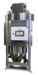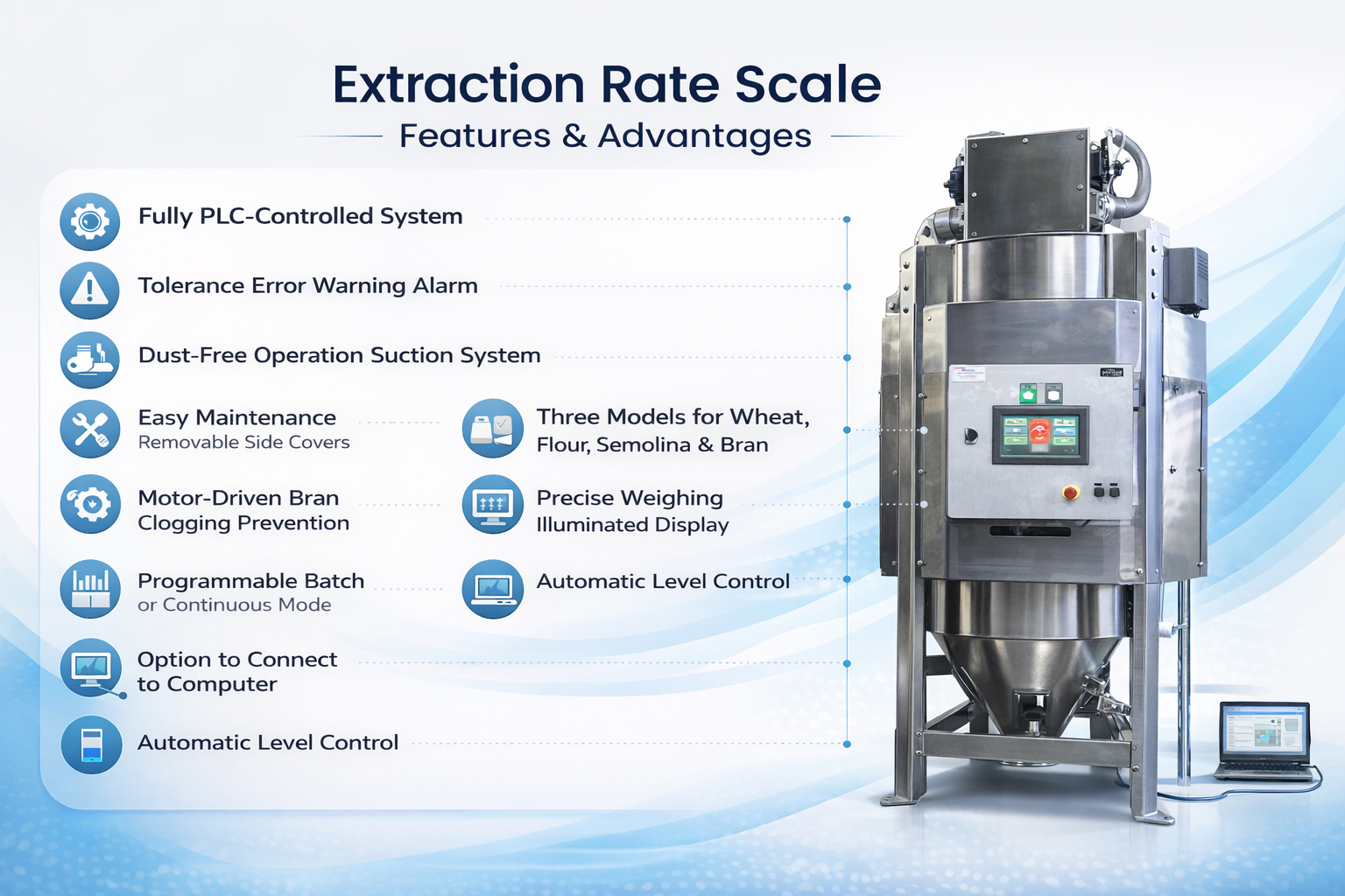 The existing product in the upper hopper is transferred to a weighing chamber via a pneumatically controlled gate in the inlet box. Meanwhile, the weighing chamber gate remains closed. The required weight is measured by the weighing compartments, and this data is sent to the PLC system. The PLC system then opens the weighing chamber gate, allowing the product to be discharged into the lower hopper. When the final product batch fills the lower hopper, the capacitive level control switch sends this information to the PLC system, and the filling process repeats.